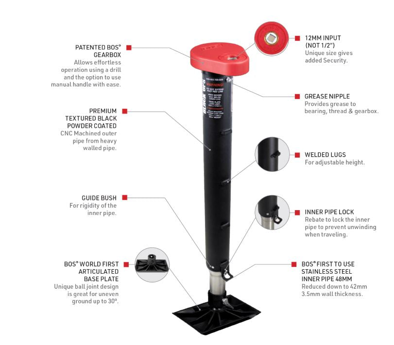 - Patented BOS® Gearbox features a unique 12mm drive set for added security and provides effortless operation with a cordless drill or manual handle as a backup.