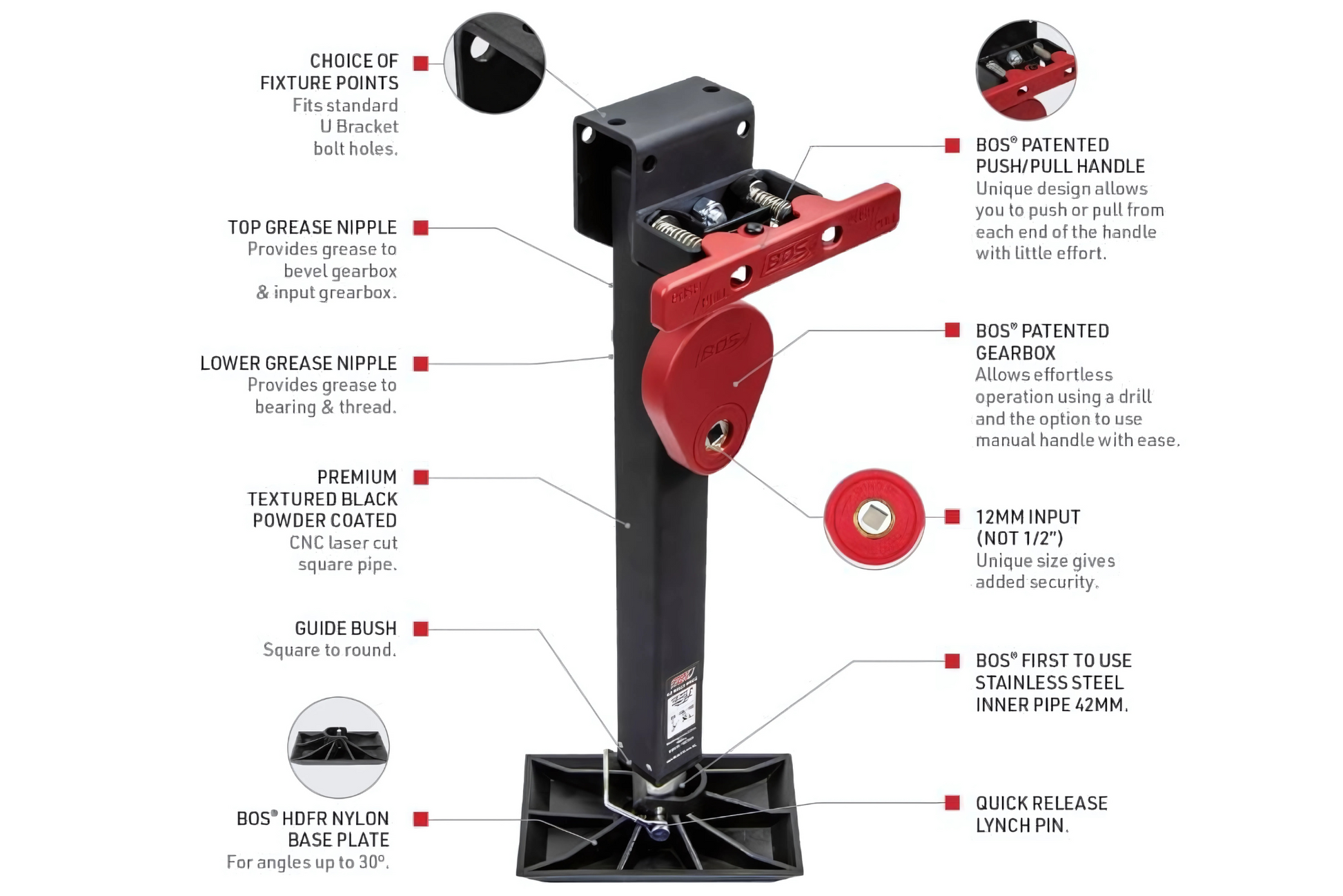 - Patented BOS® Gearbox features a unique 12mm drive set for added security.